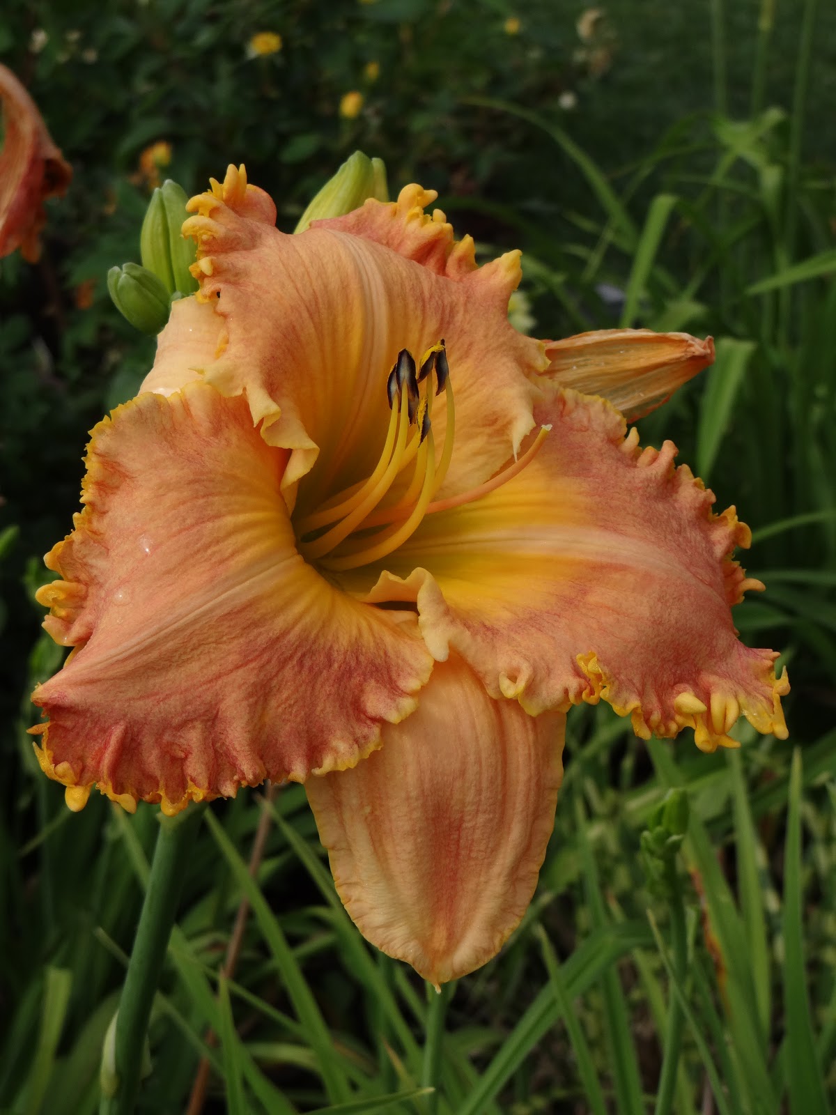 35” tall, this 5.5” bloom glows fiery orange and gold. A tetraploid bicolor with tightly ruffled petal edges and paprika-colored stippling on sepals; it is a great, consistent addition to the garden and to daylily exhibition shows. It is the first bicolor to give me a double take in the garden. The color is clear and it is distinct with raised midribs and slightly carved texture. Here are three shots, a typical garden face, the scape and buds, and the "glamour shot."
